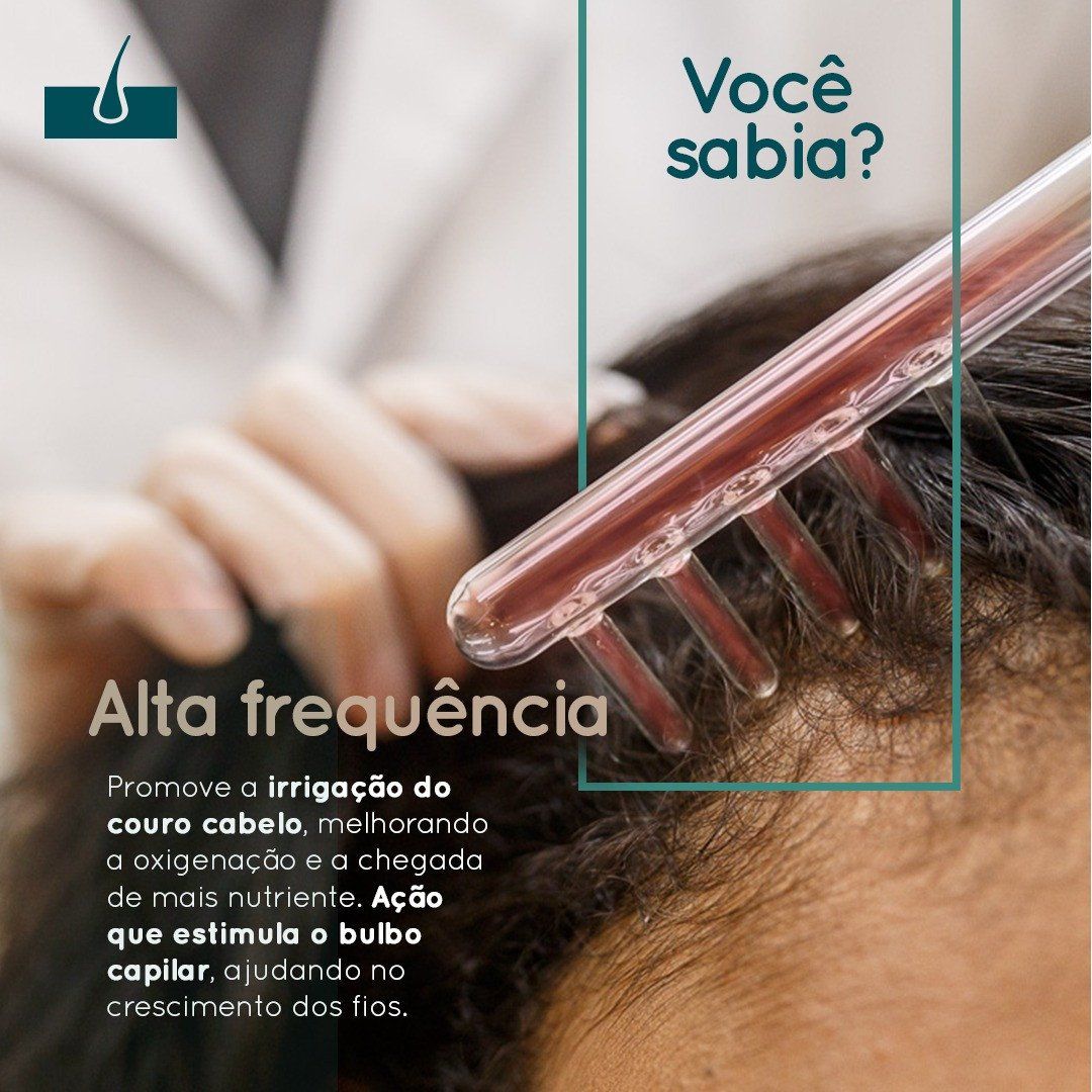 Alta Frequência - Possui função fungicida, bactericida e vasodilatadora, com isso, conseguimos melhorar a oxigenação do couro cabeludo, auxiliando a chegada de mais nutrientes aos folículos.