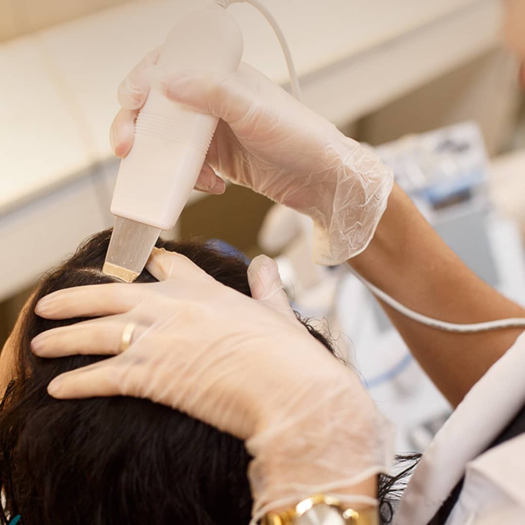 Peeling Ultrassônic - Através ondas ultrassônicas e vibrações de alta frequência, o peeling ultrassônico remove células mortas, ajudando na renovação celular. Além disso, é capaz de promover uma esfoliação profunda no couro cabeludo, o que auxilia no tratamento de processos de descamação.